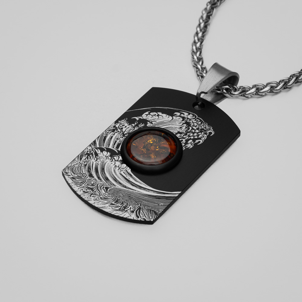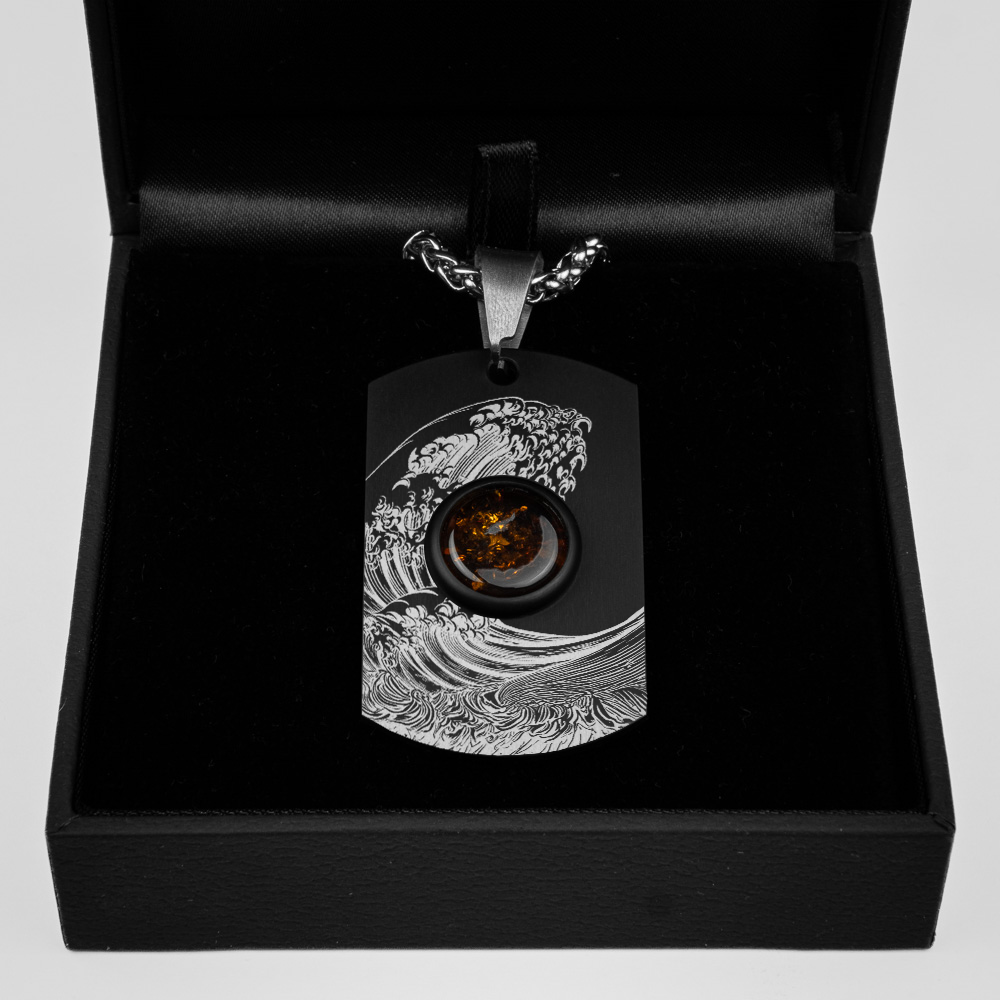 Wykonany wraz z Tomaszem Ołdziejewskim - Nieśmiertelnik Tytanowy z osadzonym dużym bursztynem bałtyckim. Starannie wyszlifowany z dbałością o najmniejszy szczegół. Dodatkowo przyozdobiony grawerowanym laserowo wzorem japońskiej fali Kanagawa. Powłoka wykonana przy wykorzystaniu technologii DEEPBLACK™.