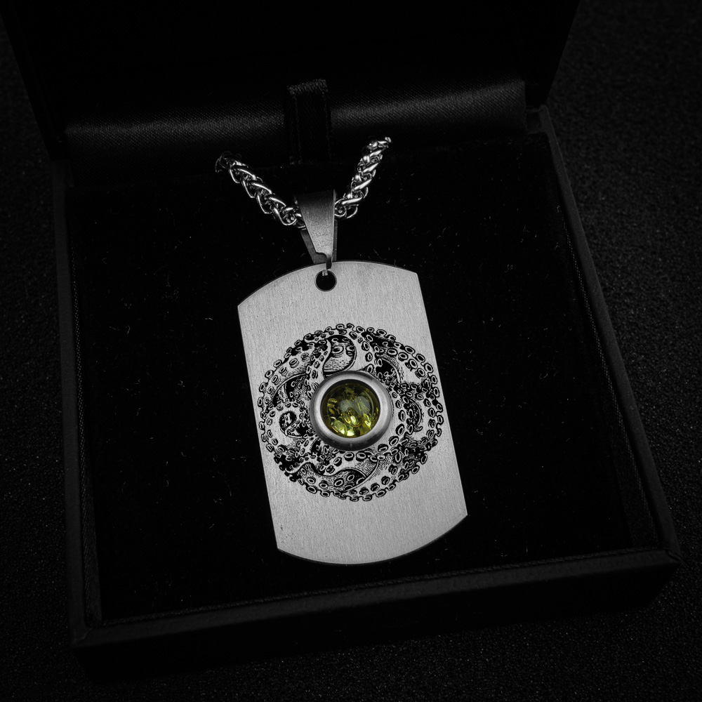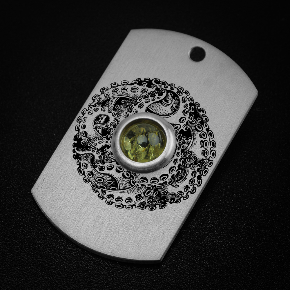 Wykonany wraz z Tomaszem Ołdziejewskim - Nieśmiertelnik Tytanowy z osadzonym bursztynem bałtyckim. Starannie wyszlifowany z dbałością o najmniejszy szczegół. Dodatkowo przyozdobiony grawerowanym laserowo wzorem ośmiornicy oplatającej bursztyn niczym skarb piracki.