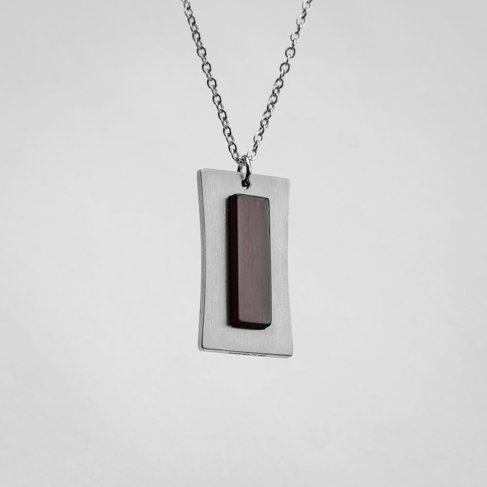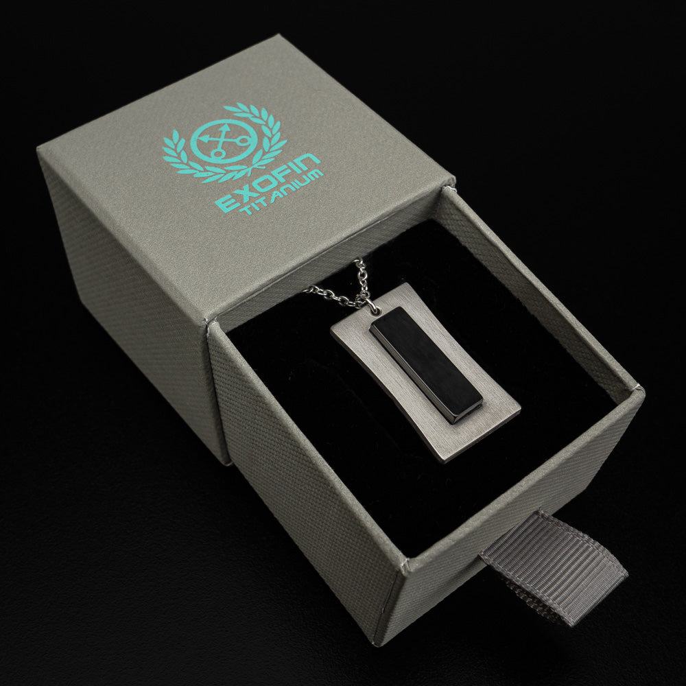 Naszyjnik tytanowy z osadzonym prostokątnym czarnym bursztynem. W zestawie z łańcuszkiem oraz opakowaniem.