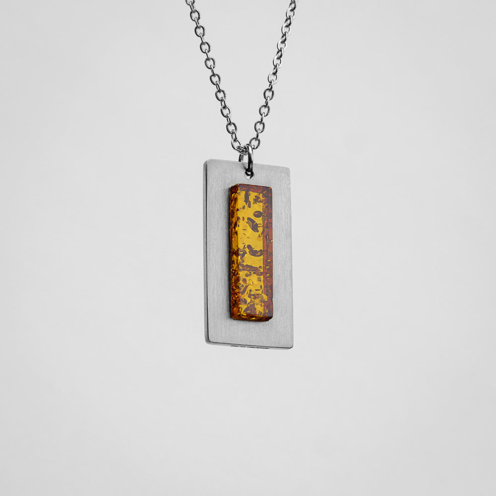 Naszyjnik tytanowy z osadzonym prostokątnym koniakowym bursztynem. W zestawie z łańcuszkiem oraz opakowaniem.